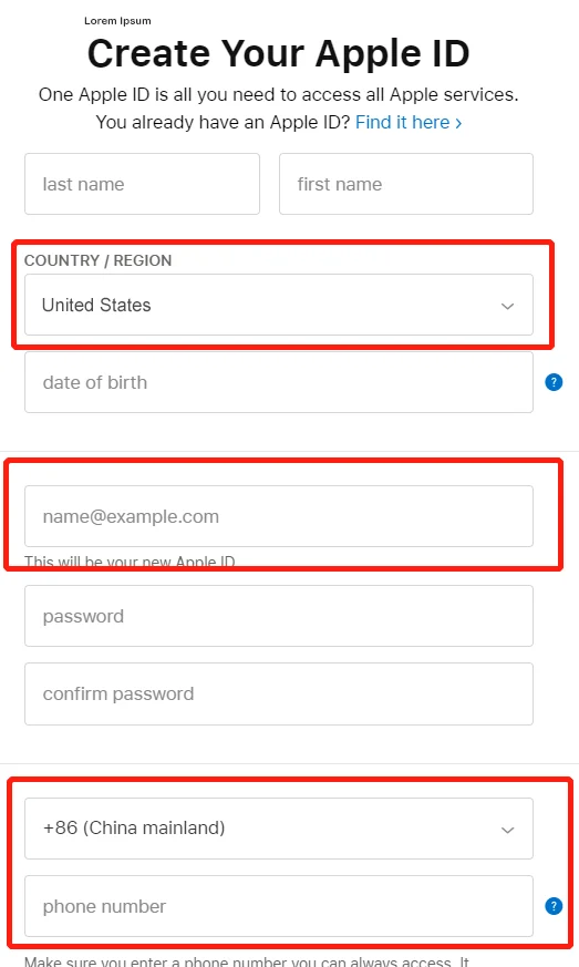 Enter your personal information according to the field. Select "United States" in the Country/Region. In addition: Email: You need a new email address that has never been registered with an Apple ID to receive the verification code. Mobile number: Support mobile number verification for Mainland China.