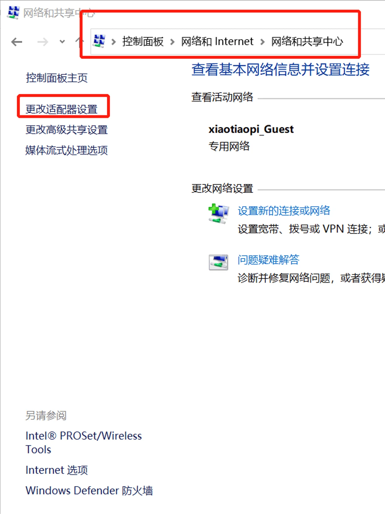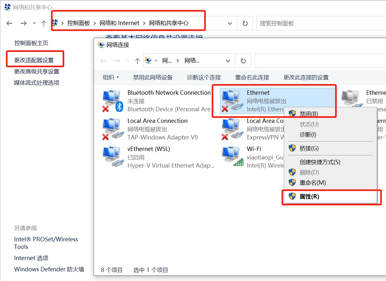 更改电脑 DNS 为 114.114.114.114 和 8.8.8.8. 方法如下: 打开"控制面板" -> "网络和 Internet" -> "网络和共享中心",选择"更改适配器设置"。