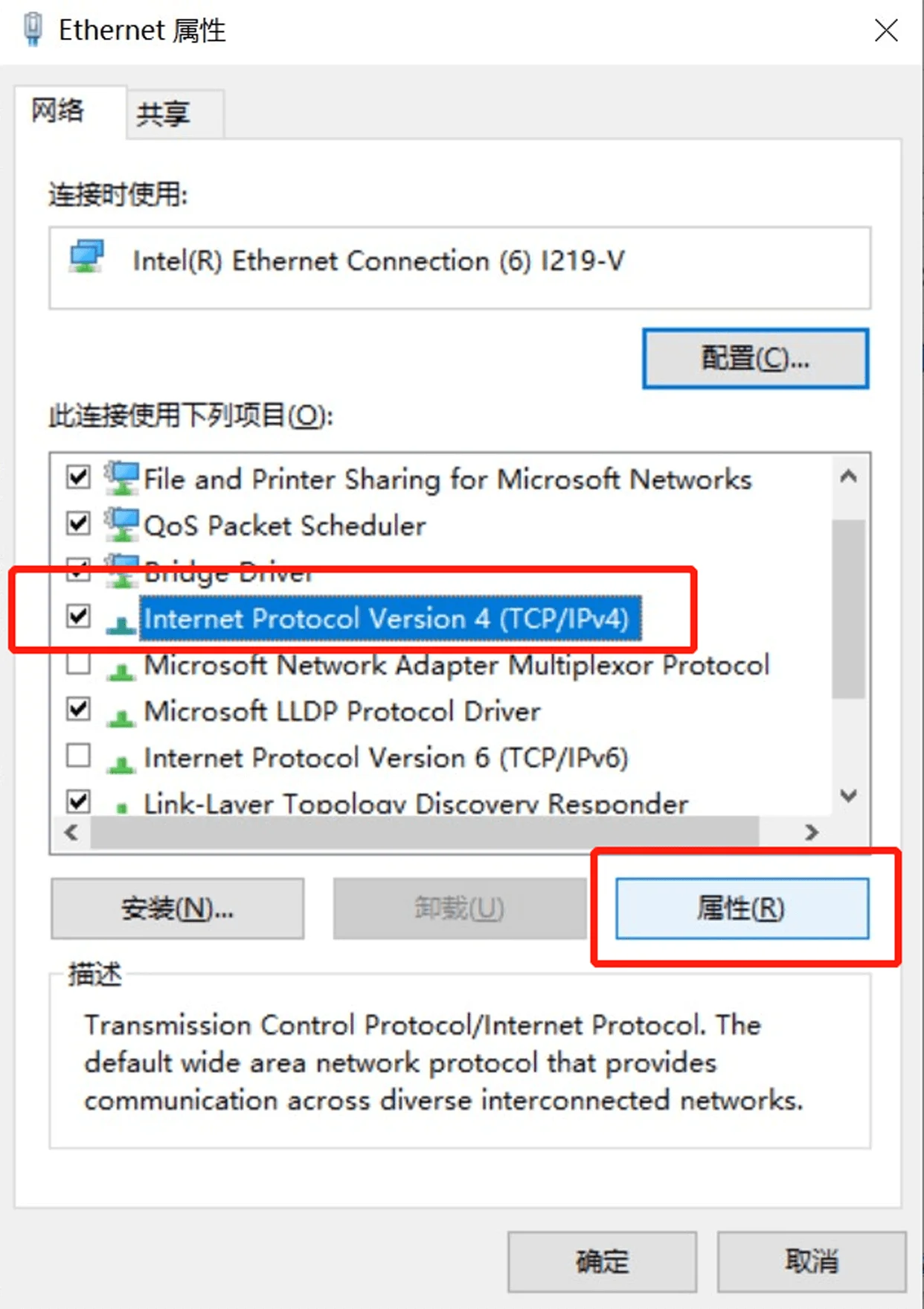 找到 “Internet 协议版本 4(TCP/IPv4)”, 点击 “属性”。