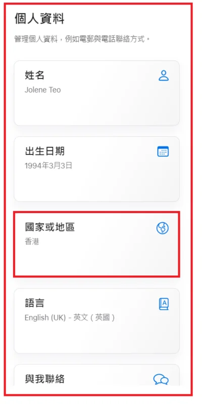 在個人信息頁麵點擊選擇 “國家或地區” 選項。