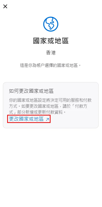 在國家或地區頁面選擇 “更改國家或地區”。 若提示無法更改國家或地區,請使用其他方式下載。