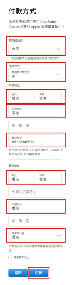 此時您已經進入到付款方式頁面,請按照下述描述填寫相關信息:國家或地區:香港。付款方式:無。帳單寄送地址:姓氏,名字,街道地址可以隨意填寫。電話號碼:852 + 任意 8 位數字。郵寄地址:姓氏,名字,街道地址可以隨意填寫,國家或地區選擇香港。填寫完畢後,最後點擊最底部的更新按鈕即可。 若付款方式無法選擇 “無”,請使用其他方式下載。