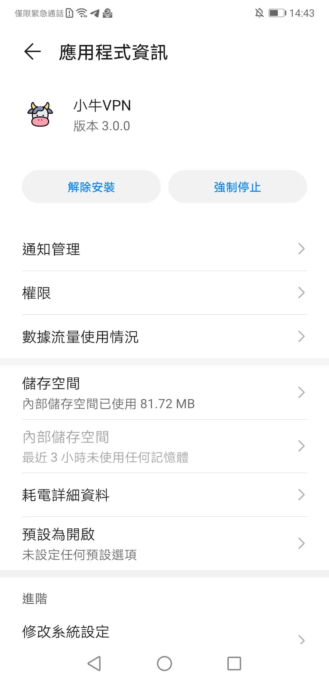去到 設定 -> 應用程式 -> 應用程式管理 -> 小牛 VPN,點 “強制停止”。或者 去到 設定 -> 應用程式和服務-> 應用程式管理 -> 小牛 VPN,点 “强制停止”