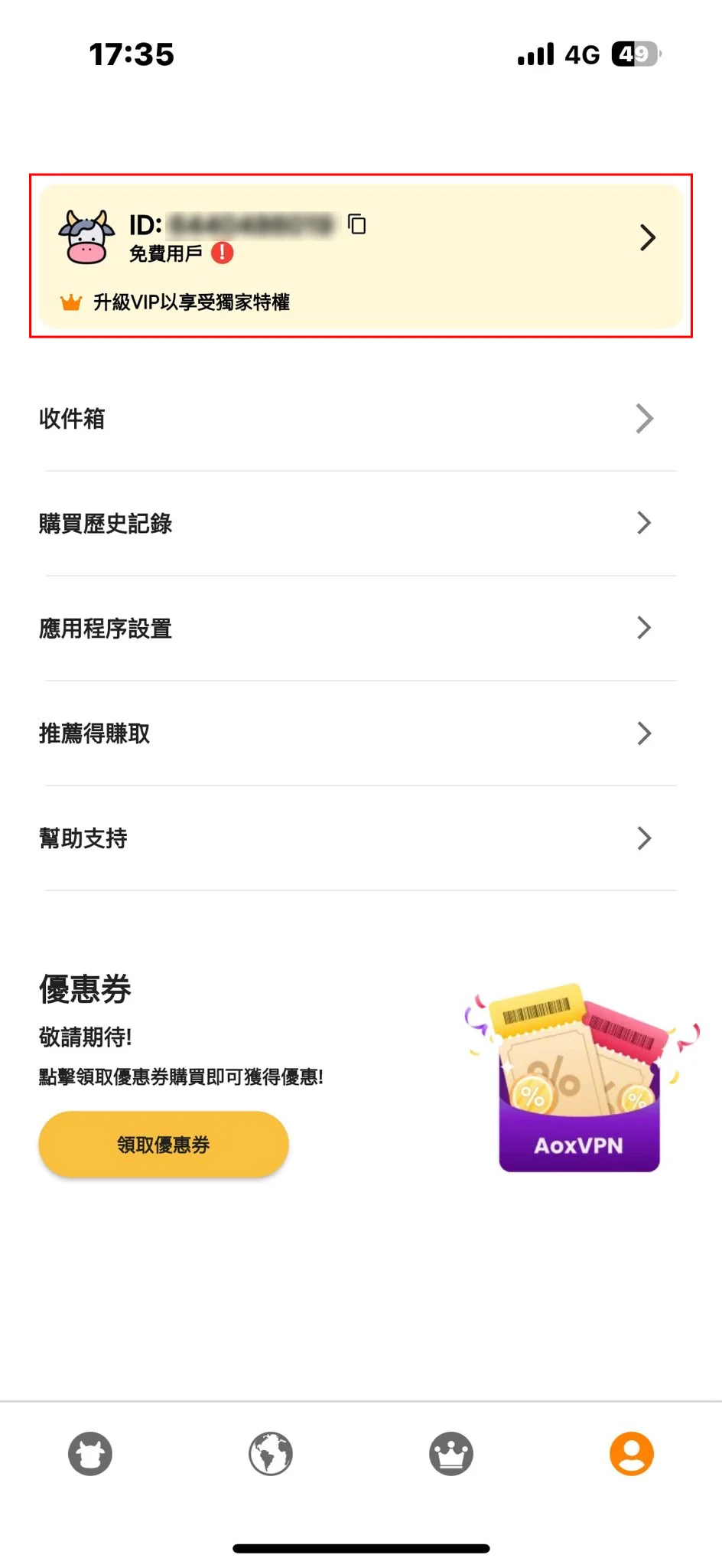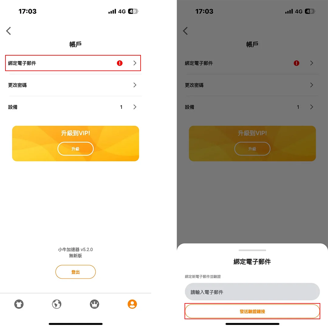 在小牛加速器應用程式上,前往帳戶頁面。點擊頂部橫幅進入帳戶設定頁面。