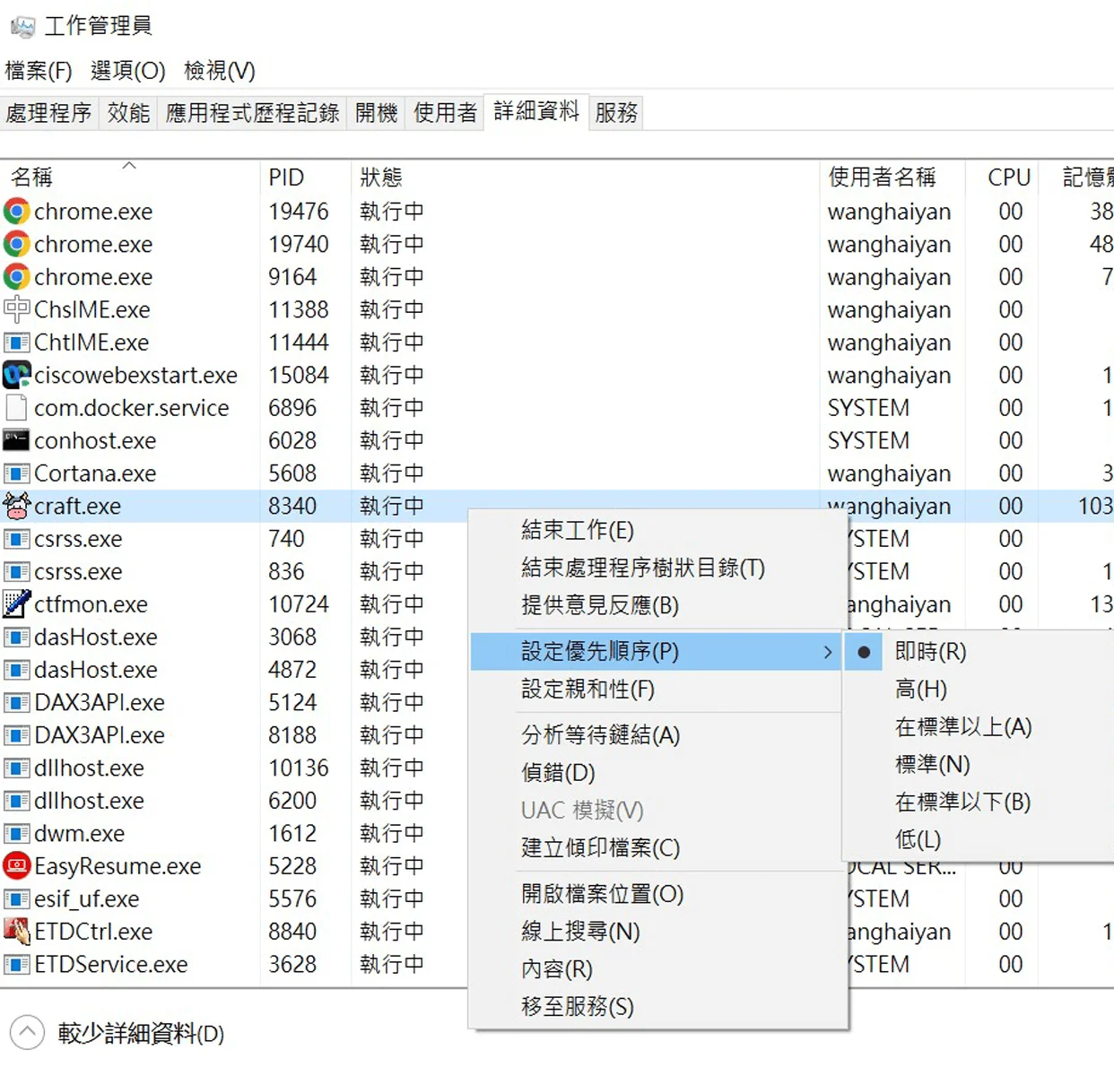 任務管理器裡,選擇 “詳細資料”,找到 craft.exe,即時設置為 “即時”。